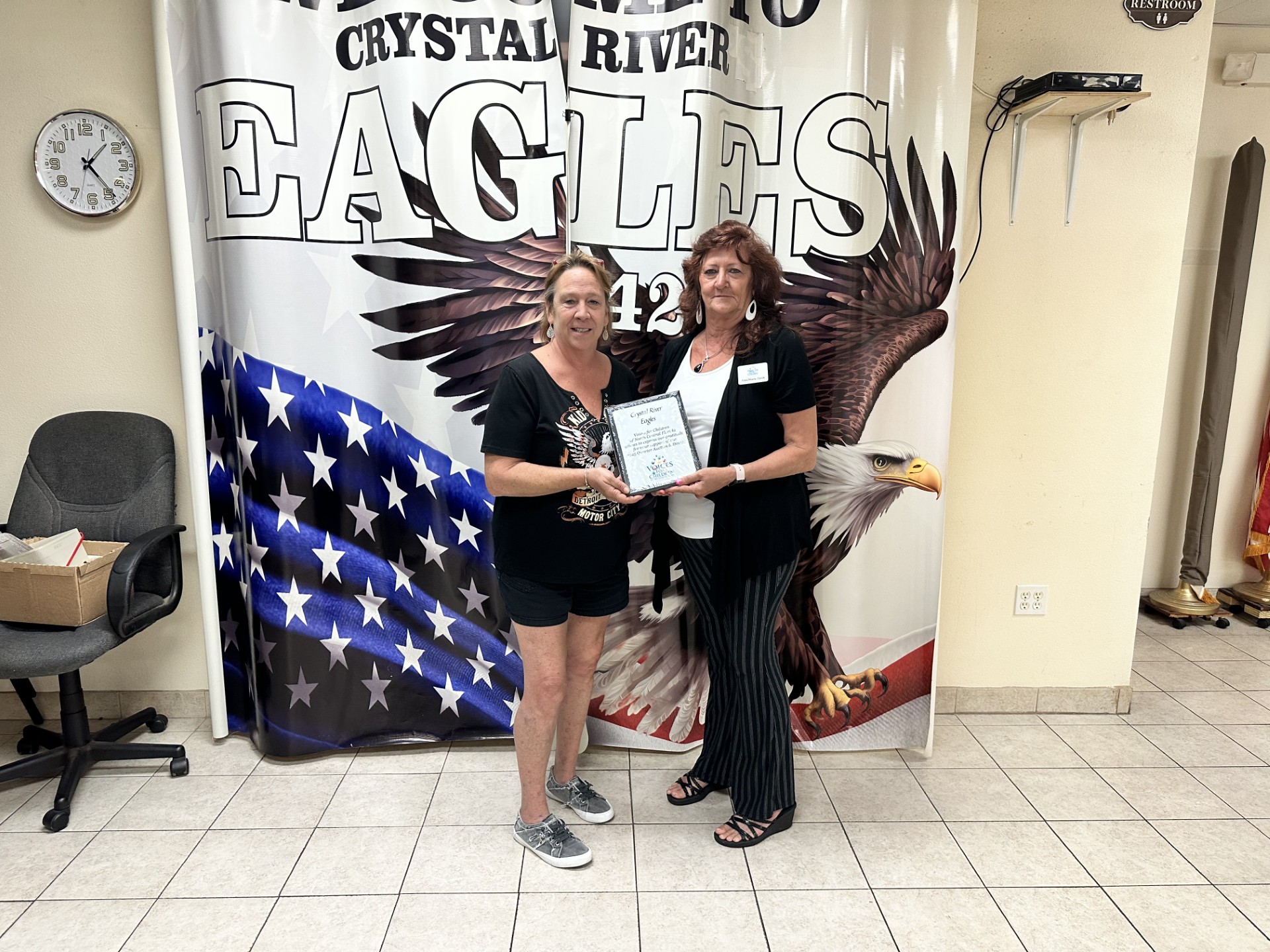 Pictured is Sheryl Stone (l) of the Crystal River Eagles receiving a thank you plaque from AnneMarie Zarek of VFC for their recent support of our annual dinner and auction. The club is always willing to support our events, knowing the funds we raise are ultimately to support the children in our community...